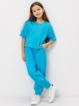 Комплект для девочки (футболка, брюки-карго) в голубом цвете с печатью