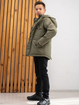 Парка зимняя подростковая для мальчика с капюшоном цвета хаки 9533Kh