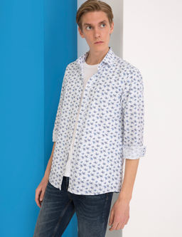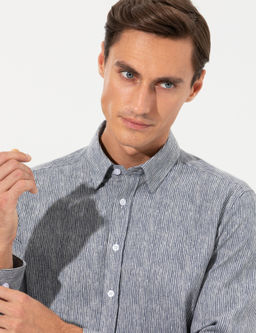 Синяя рубашка узкого кроя из смесового льна с длинным рукавом