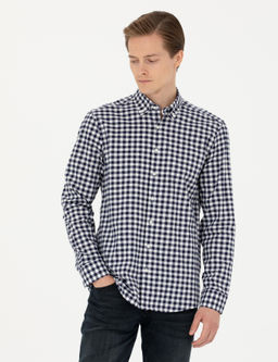 Темно-синяя приталенная рубашка в клетку с длинными рукавами