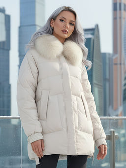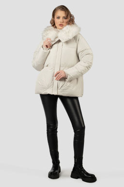 Куртка женская зимняя с капюшоном большого размера бежевого цвета 1170B