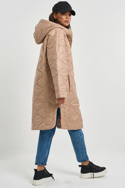 Куртка зимняя с капюшоном удлиненная стеганная бежевого цвета 9650B