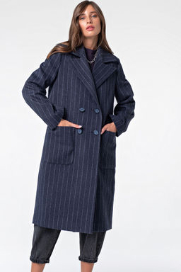 Пальто двубортное прямое шерстяное в полоску кофейное