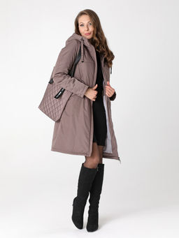 Коричневое стеганое пальто с розовой подкладкой из плащевки