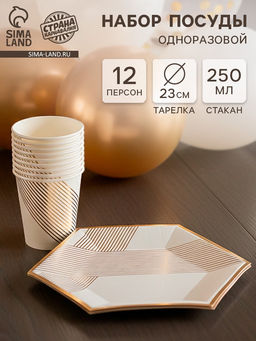 Посуда одноразовая бумажная на 12 персон, 24 предмета, бело-золотой цвет