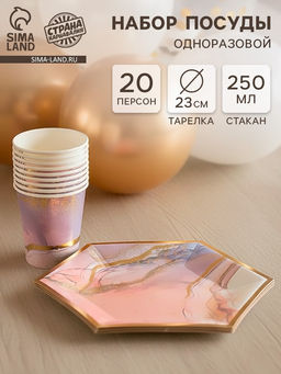 Посуда одноразовая бумажная на 20 персон, 40 предметов, мрамор розовый