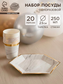 Посуда одноразовая бумажная на 20 персон, 40 предметов, мрамор белый