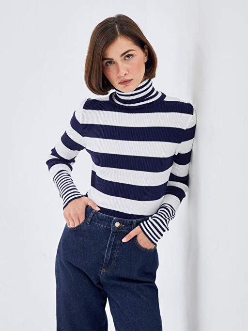 Bal?k?? Yaka Renk Bloklu Kad?n Triko Kazak