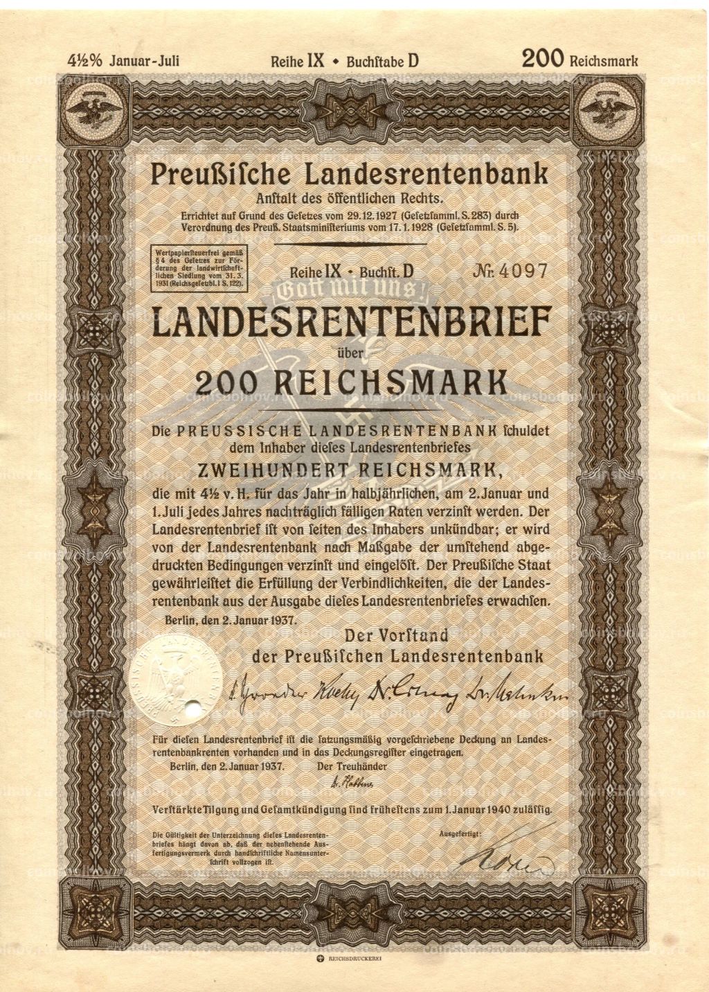 • Облигация 4,5% 200 рейхсмарок 1937 года Германия