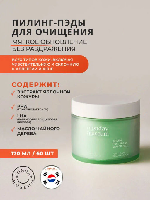 Описание товара Натуральные пилинг-пэды Monday Museum — это инновационный уход «3-в-1», который заменяет тоник, тонер и пилинг, делая кожу гладкой, увлажнённой и сияющей всего за один шаг. Разработанные специально для мягкого и деликатного отшелушивания кожи. Эффективная формула, которой обладают пэды, споосбствует эффективному очищению поверхности эпидермиса, удалению ороговевших частичек клеток кожи и излишков себума. Благодаря своему сбалансированному составу, пэды восстанавливают эластичность, гладкость и упругость кожи. Пэды являются двусторонними и имеют отличительную текстурную особенность каждой из сторон. Первая, более рельефная, предназначена для первого этапа применения, отвечающего за активное очищение. При помощи второй, гладкой, стороны удаляются излишки состава средства, кожного себума и других бытовых загрезнений кожи, а также обеспечивается успокаивающий и разглаивающий эффекты. В результате регулярного применения пэды заметно улушают тон кожи, смягчают и увлажняют ее, эффективно устраняя тусклый цвет и возвращая коже здоровое сияние. Приобрести пилинг пэды Вы можете в нашем магазине оригинальной корейской косметики.