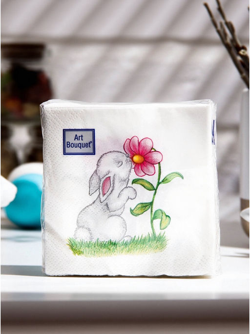 Пасхальные сервировочные бумажные салфетки Art Bouquet с рисунком «Милый зайчик» - это отличное украшение для вашего праздничного стола. Идеально подойдут как для сервировки, так и в качестве декора и украшения в домашних условиях или на больших мероприятиях. Праздничные салфетки с пасхальным рисунком будут хорошим подарком для родных и близких. Данные салфетки можно использовать так же для декупажа и коллажей.Салфетка состоит из 100% целлюлозы. Размер салфетки в развёрнутом виде 20х20 см, в сложенном виде 10х10 см.С наступающим праздником Светлой Пасхи! Размер, см: 20 х 20. В наборе, шт.: 30. Фасовка, шт.: 30. Тематика: Пасхальная. Символ года: Нет. Тематика праздника: Пасха. Тип бумаги: Двухслойная. Вид: С рисунком. Бесплатная доставка: Да.