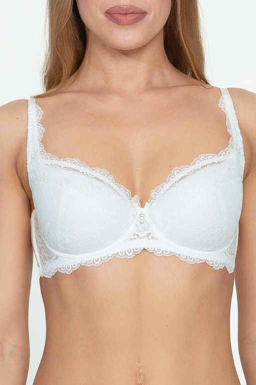 Бюстгальтер на поролоне на каркасах. Выполнен из эластичного кружева и эластичного полотна. На стане бюстгальтера вертикальные упругие, корректирующие пластины, позволяющие прилегать к телу и не скручиваться боковой части бюстгальтера. Украшение: бантик с подвеской из трех страз.­