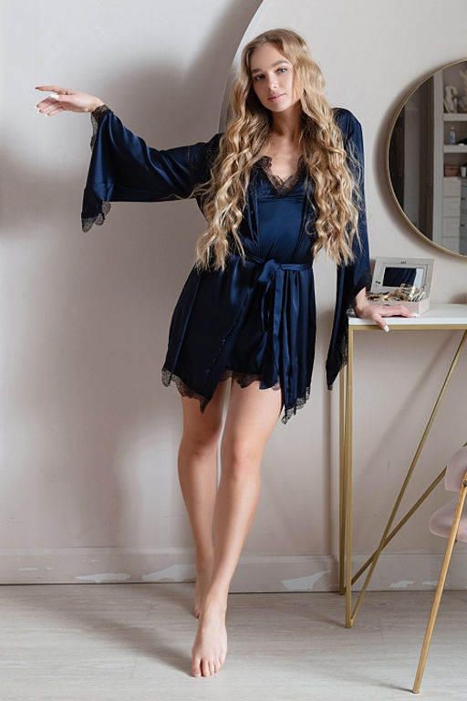 Игривый, струящийся и изящный халат из темно-синего армани шелка. Халат с элегантными рукавами и кружевом, притягательного темно-синего цвета, в котором ты точно не останешься не замеченной. А поясом от халата ты можешь связать руки любимому или завязать глаза. Дополни образ темно-синей сорочка с маской на глаза!­