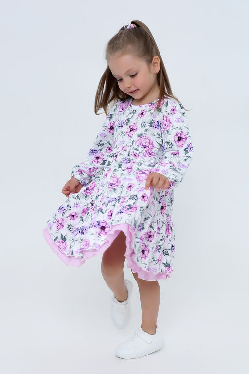 Платьице с длинным рукавом порадует своей продуманностью деталей: свободный рукав, аккуратно зафиксированный аккуратной резинкой, уютно облегает ручку ребенка, позволяя избежать дискомфорта и обеспечивая комфортное надевание и снятие изделия. Круглый вырез горловины подчеркивает изящность шеи и дарит дополнительное удобство.