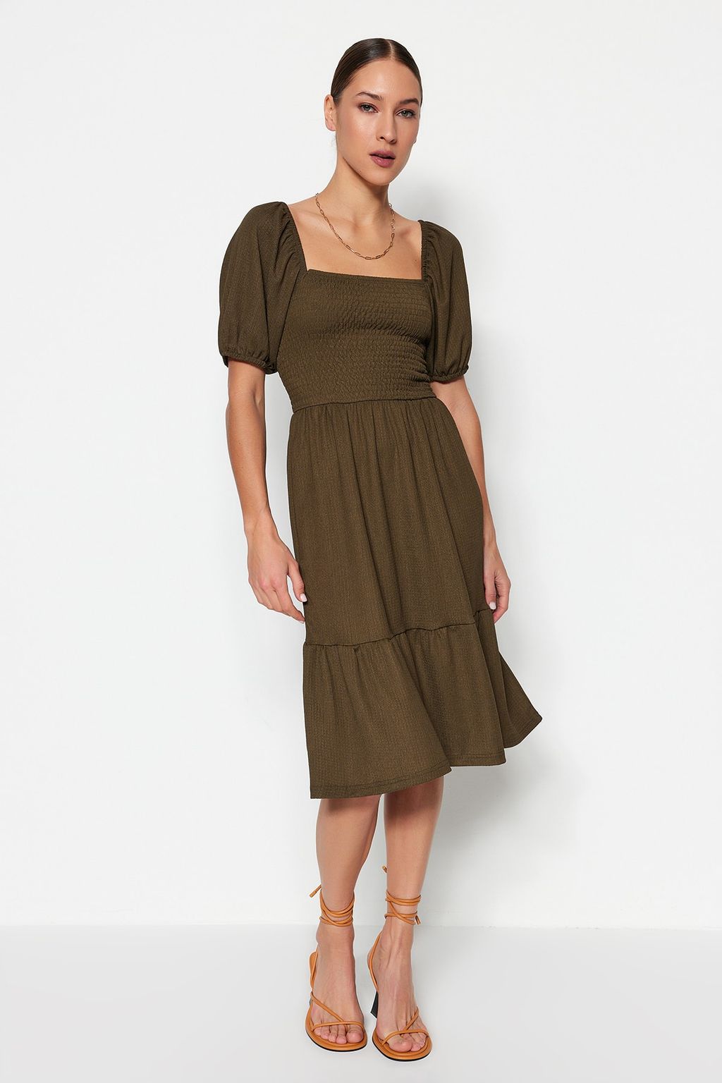 • Haki Gipeli Belden Ac?lan/Skater Kare Yaka Balon Kol Midi Burumcuk Orme Elbise TWOSS22EL1088