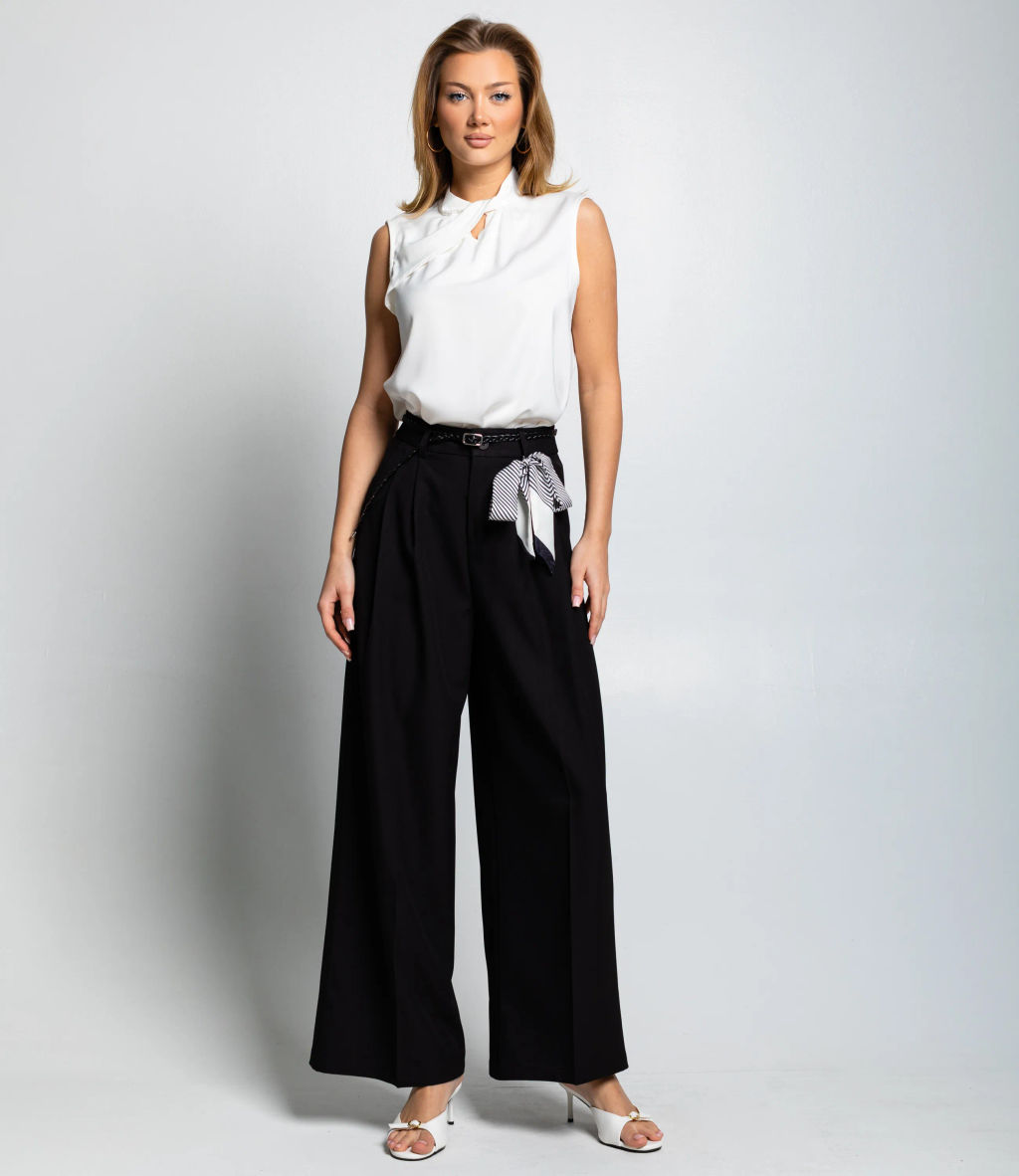 Брюки это одежда, которая подчеркивает привлекательность любой женщины. Брюки-палаццо с высокой посадкой и широким кроем, расширяющимся от талии к низу. Впереди аккуратные складки для элегантности. Пояс с декоративным тканевым галстуком в диагональную полоску, завязывается сбоку. Длинные штанины с подгибом у низа. Плотная, но струящаяся ткань. Универсальны для делового и повседневного образа. Для пошива использована ткань из 65% полиэстер и 35% хлопка, которая характеризуется отменным качеством. Даже после многократных стирок изделие не утратит первоначальной привлекательности. Вы сможете предлагать их своим покупателям с радостью. Обратите внимание на цвет: он насыщенный и полностью соответствует фотографии на сайте. Чтобы вы были уверены в размере, мы представили на странице таблицу размеров. Воспользовавшись ею, вы сможете сами обмерить себя и удостовериться в правильности выбора. Установленная нами оптовая цена является доступной. Для оптовых клиентов действуют выгодные условия сотрудничества и гибкая система скидок; уточнение минимального заказа и сроки поставки можно узнать у менеджера. -- Характеристики -- Цвет: черный Пол: Женский Страна производитель: Китай Сезон: Демисезон Материал: Хлопок, Полиэстер