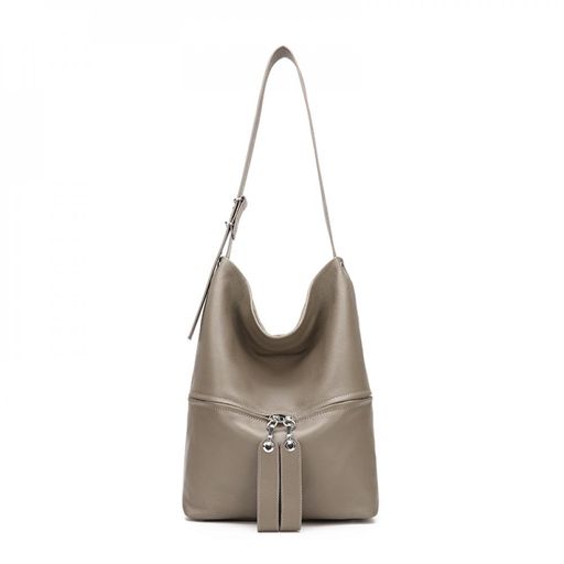 Сумка-хобо MIRONPAN оригинальной формы выполнена из натуральной зернистой кожи серого цвета. Основное отделение закрывается на молнию. Внутри есть 4 боковых кармана для мелочей: 2 открытый и 2 на молнии. На передней стенке  вместительный карман на молнии с кожаными поводками. На тыльной стороне предусмотрен карман быстрого доступа на молнии. Дно сумки защищают 4 металлические ножки.  Удобная широкая ручка, шириной -4 см, регулируется по высоте позволяет носить аксессуар на плече .