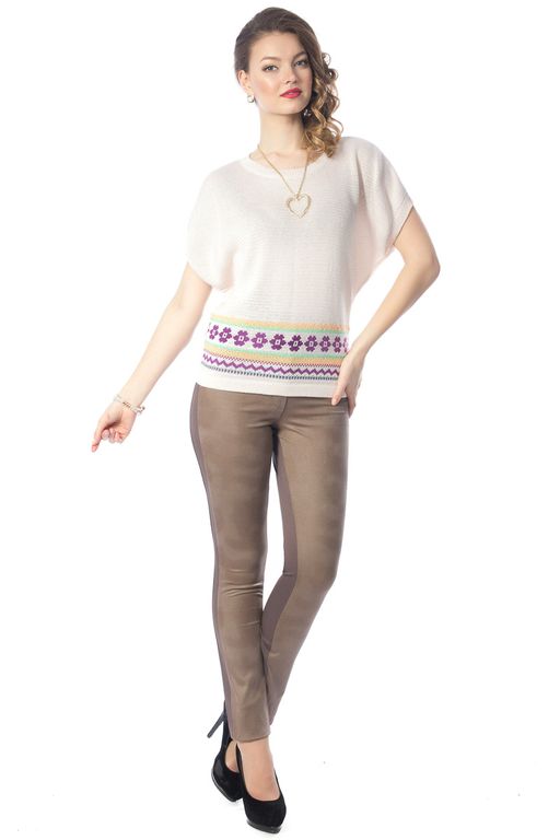 Молодежные брюки со вставками из полотна, имитирующего "мокрую кожу". Задняя кокетка и широкий пояс брюк подчеркивают линию талии. Передняя застежка на молнию и пуговицы.