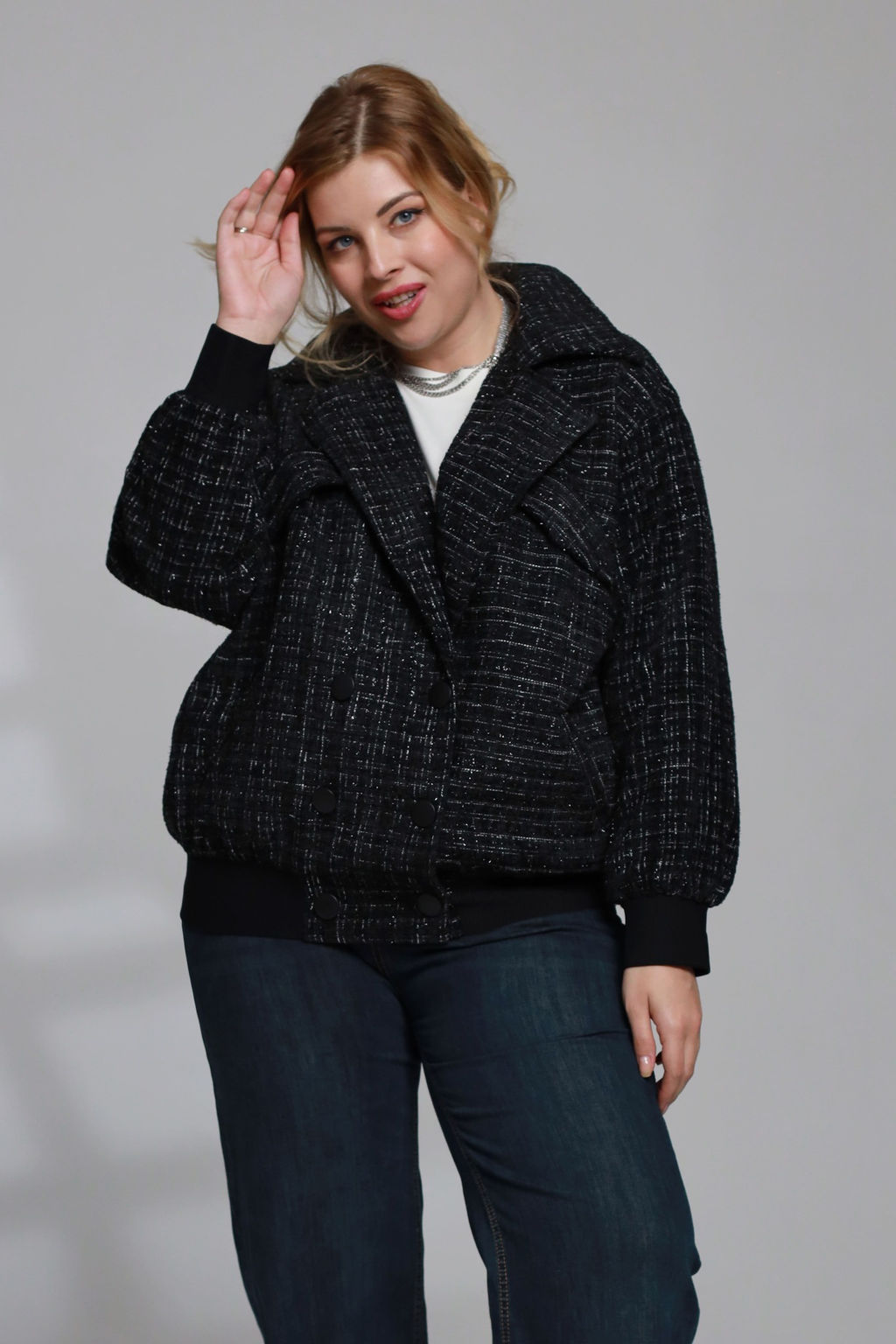 Стильный двубортный жакет свободного кроя из мягкого фактурного материала на пуговицах. Английский воротник, длинные свободные рукава с прямыми манжетами-резинками, 2 удобных практичных кармана, которые позволяют хранить необходимые вещи под рукой. Послужит прекрасным дополнением к вашему гардеробу.­