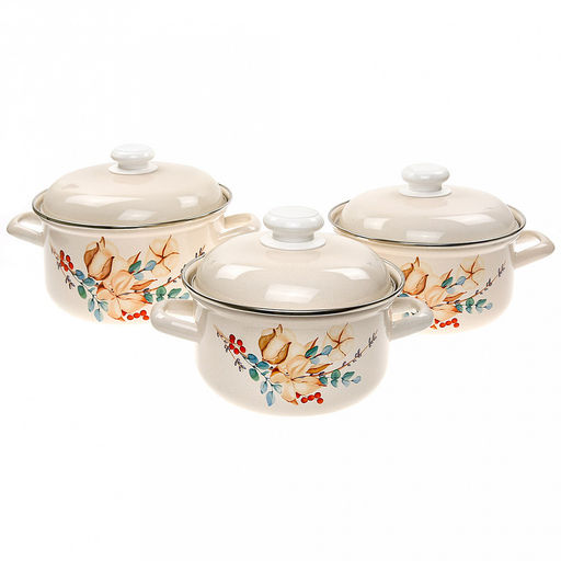 • "Унесенные ветром" Набор эмалированных кастрюль 3 предмета: 1,5л, 2л, 3л, s0,8мм, форма цилиндрическая, низкая, двойной слой эмалевого покрытия, металлическая крышка (Россия)
