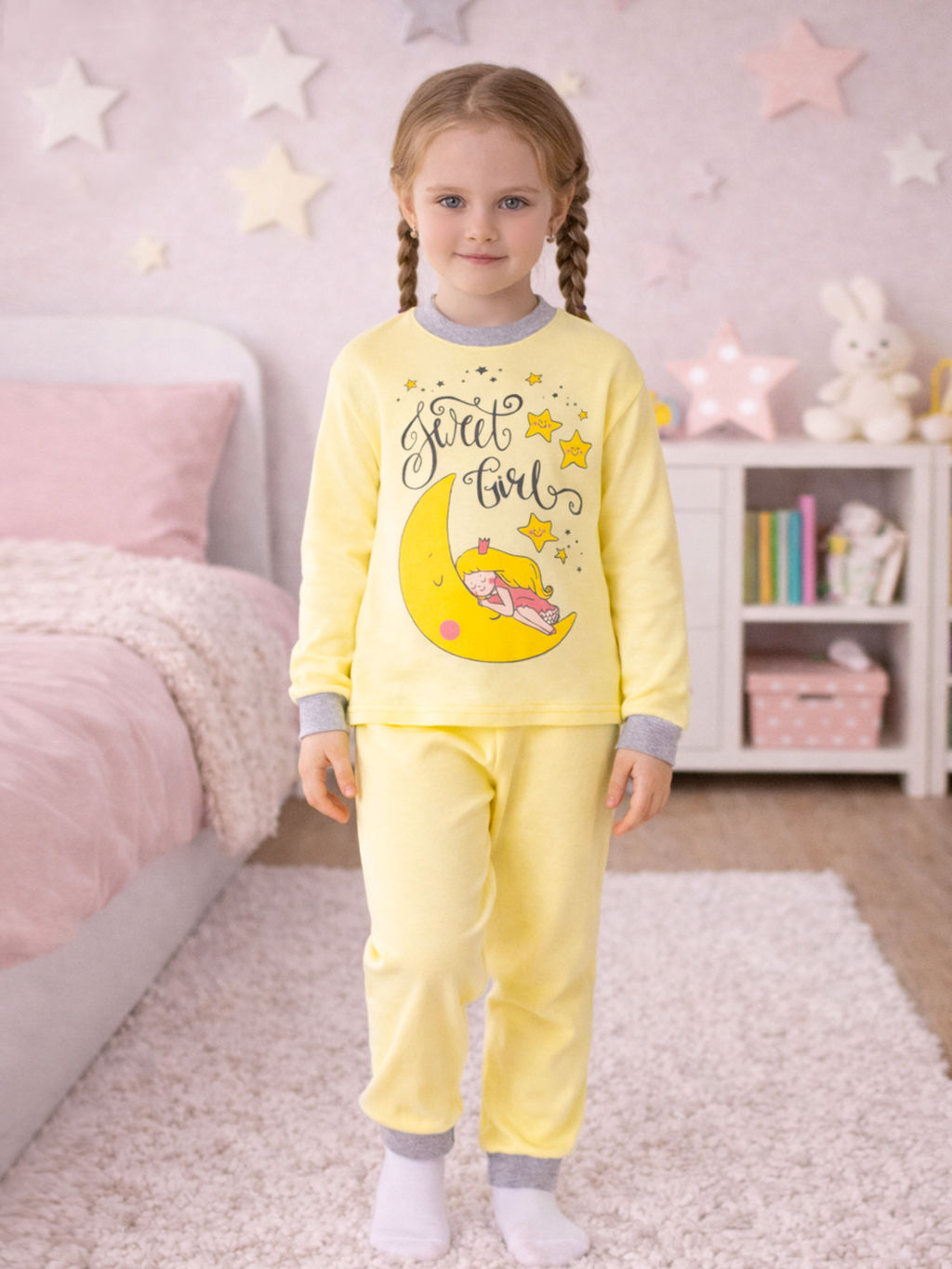 Детская пижама свободного кроя светло-желтая из свитшота и брючек на поясе с резинкой. Комплект сшит из нежного хлопкового интерлока. На рукавах и штанинах мягкие манжеты, горловина обработана эластичной бейкой, в цвет пижамы или контрастного серого цвета. Спереди свитшота большой принт спящая принцесса на месяце. В этой пижаме ничего не будет сковывать движения ребенка, ему будет комфортно спать. Хорошо подходит для дома и детского сада, а также для пижамных вечеринок.