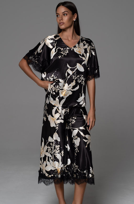 Комплект Mia-Amore состоит из блузки со спущенным плечом и укороченных расклешённых брюк, выполнен из принтованного смесового шёлка. Рукава блузки и низ брюк украшены изящным широким кружевом. По центру блузки лифа бантик. Состав:70% натуральный шелк, 25% полиэстер, 5% эластан