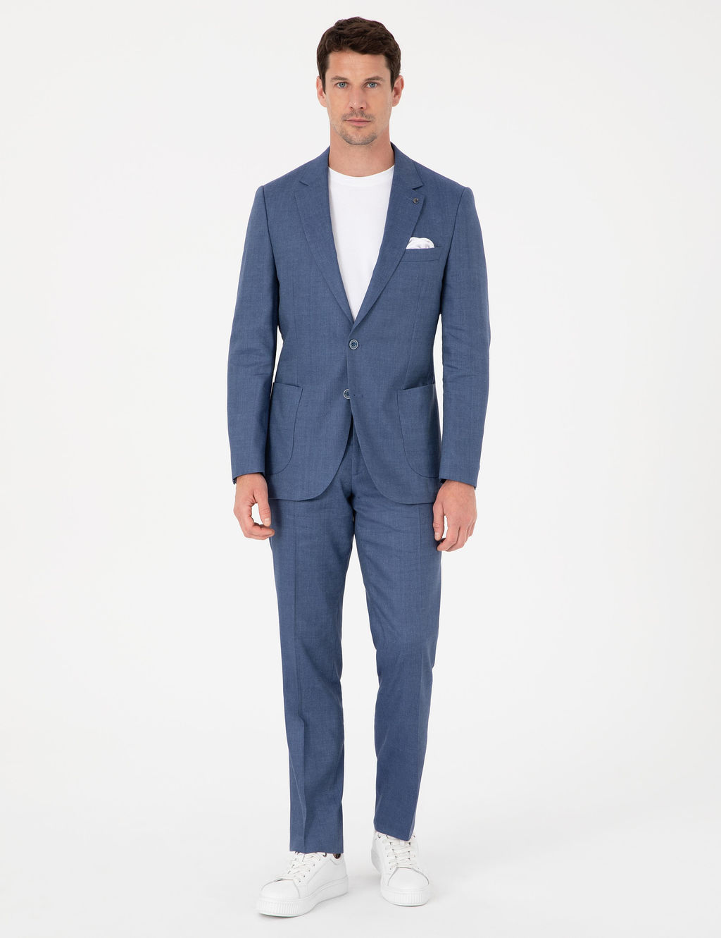 Мужской костюм Cacharel Slim Fit индиго из льна. Приталенный крой создает современный силуэт, льняная ткань обеспечивает комфорт в теплом сезоне. Комплект состоит из пиджака и брюк, подходит для повседневных и торжественных мероприятий в жаркую погоду.