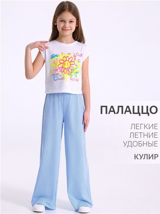 Уценка -70% брюки,хлопок 100%,кулир / хлопок 100%,- / полоска рубашечная голубой / - / - / - / -,Брюки-палаццо для девочки из кулира - лёгкого хлопкового полотна с лайкрой. Изделие без карманов на удобном эластичном поясе. Уход: только машинная стирка (руками не стирать!) при температуре 40 градусов, без предварительного замачивания.