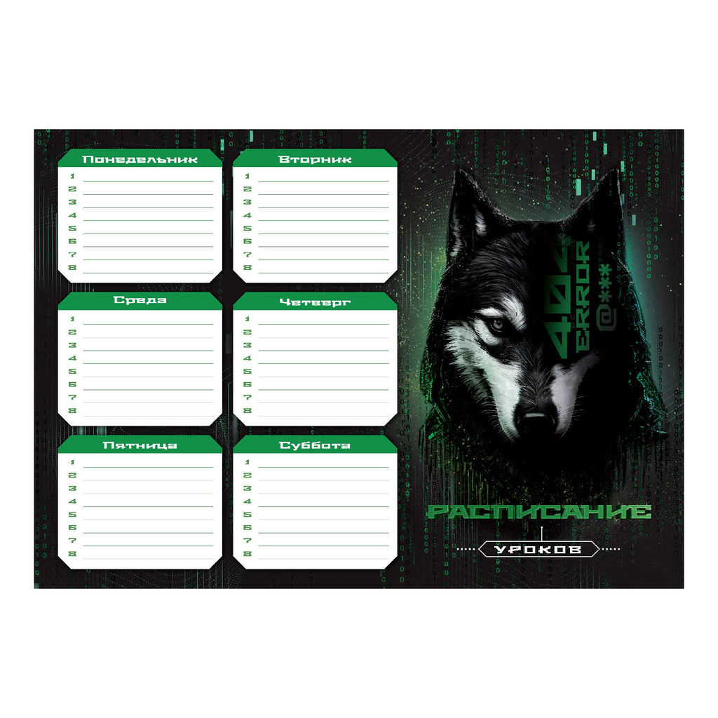 Расписание уроков А4, арт. 67661/ 50 КИБЕРЖИВОТНЫЕ (210x297 мм, материал: мелованный картон 235 г/м?, полноцветная печать, декор: выборочный УФ-лак; цвет: зелёный, серый, чёрный; индивидуальная упаковка: нет)