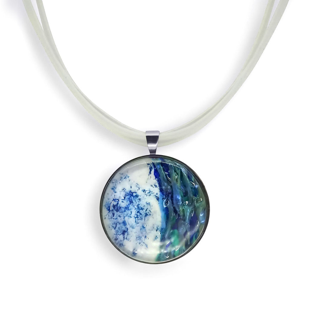 Колье изготовлено из натуральной кожи, муранского стекла и гипоаллергенной ювелирной стали, что очень важно для людей с чувствительной кожей. Металл не темнеет и не подвергается воздействиям окружающей среды, надолго обеспечивая красивый внешний вид изделия. Длина колье - 46 см + 5 см. удлиняющая цепочка. Диаметр стеклянного элемента - 3 см. Вес - 23 гр.­