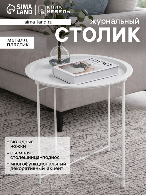 Столик журнальный «Клик Мебель»Функциональный и стильный элемент интерьера, сочетающий в себе практичность и декоративную выразительность. Модель подойдёт для гостиной, зоны отдыха или спальни, добавляя удобство в повседневное использование.Особенности столика «Клик Мебель»Съёмная столешница – поднос: верхняя часть снимается и может использоваться для подачи еды, напитков или как декоративный элемент.Многофункциональность: столик выполняет роль журнального стола и подноса, расширяя сценарии использования.Складные ножки: конструкция позволяет компактно сложить столик для удобного хранения или транспортировки.Мобильность: удобно перемещать и использовать в разных зонах дома.Декоративный акцент: дополняет интерьер и может использоваться как самостоятельный элемент декора.ПрименениеДля гостиной: подходит для размещения напитков, книг и аксессуаров.Для сервировки: поднос удобно использовать для подачи еды и напитков.Для компактного хранения: складные ножки позволяют экономить пространство.Для декоративных композиций: используется как элемент оформления интерьера. Форма: Круглая. Ширина, мм: 470. Глубина, мм: 470. Высота, мм: 500. На колёсиках: Нет. Оттенок: Белый. Поставляется в разобранном виде: Да. Примечание: Оттенок данного товара может незначительно отличаться от фото/видеоизображения (в зависимости от настроек яркости вашего экрана)..