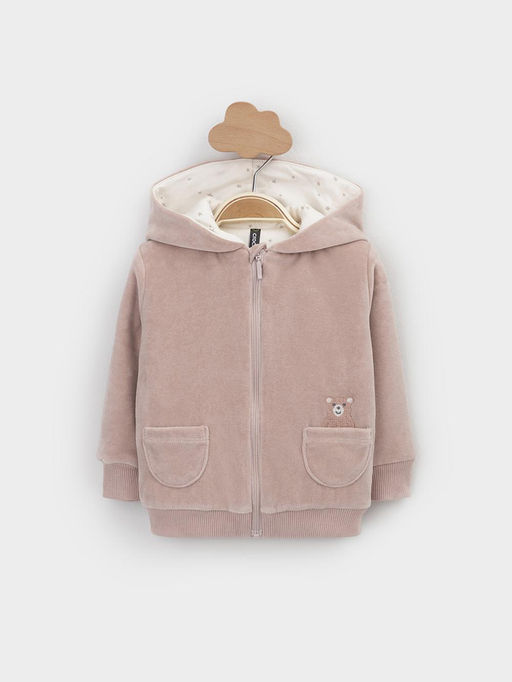Тёплая куртка из велюра для новорождённых. Внутри синтепон и подклад из натурального хлопка. Изделие застёгивается на молнию и имеет капюшон. На рукавах мягкие манжеты, внизу - эластичный пояс. Спереди два накладных кармана и украшение в виде вышивки. Все трикотажные полотна производятся в соответствии с нормами Швейцарского сертификата ЭкоТекс.. Состав: верх: 80% хлопок, 20% полиэстер; подклад: 100% хлопок; утеплитель: 100% полиэстер