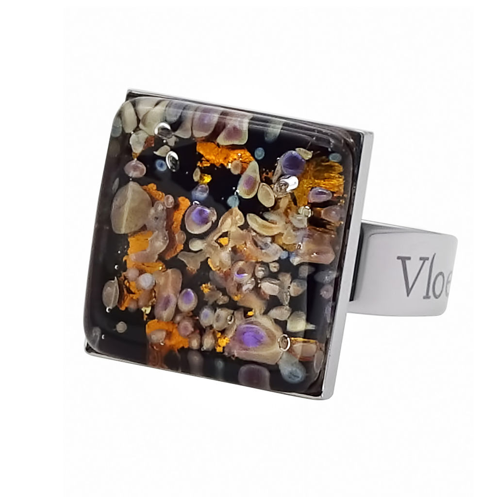 Кольцо изготовлено из муранского стекла и гипоаллергенной ювелирной стали, что очень важно для людей с чувствительной кожей. Металл не темнеет и не подвергается воздействиям окружающей среды, надолго обеспечивая красивый внешний вид изделия. Размер стеклянного элемента - 1,6*1,6 см. Кольцо безразмерное, регулируется с 16 до 19 размера. Вес - 5 гр.