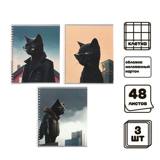 • Комплект тетрадей из 3 штук, 48 листов в клетку на гребне Calligrata «Чёрный Кот», обложка мелованный картон, ВД-лак, блок офсет
