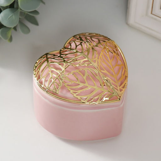• Шкатулка для украшений Сердце с листьями, для мелочи, керамика, металл розовая, 9?8.5?7.2 см