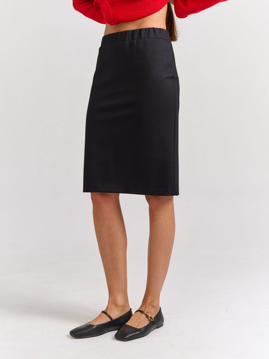 Женская юбка прямого силуэта, зауженная к низу, на круговой резинке. Юбка на подкладке, выполнена в трикотажной ткани. Классический вариант отлично сочетается с блузами, жилетами и жакетами любого формата.