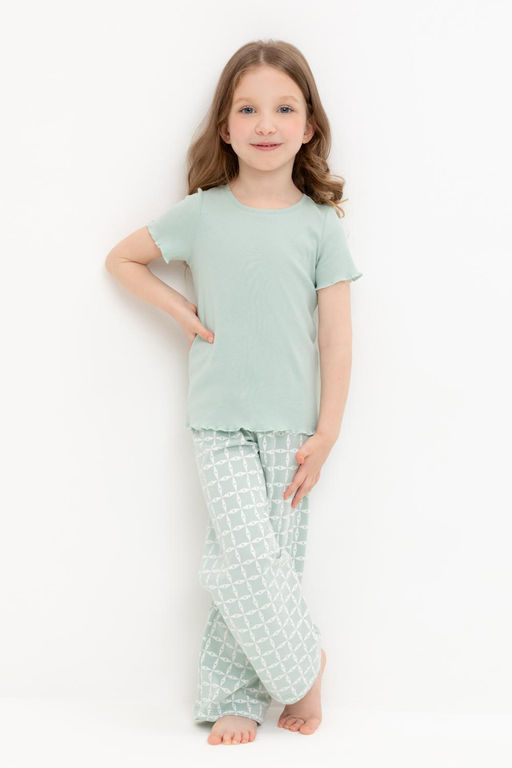 Трикотажная пижама из натурального хлопка. Футболка с короткими втачными рукавами изготовлена из эластичного трикотажа в рубчик. Брюки с эластичной резинкой в поясе выполнены из гладкого трикотажа супрем. Оригинальная набивка выполнена из стойких текстильных гипоаллергенных красителей. Изделие сохраняет цвет и форму после многократных стирок. Все трикотажные полотна производятся в соответсвии с нормами швейцарского сертификата ЭкоТекс.. Состав: 100% хлопок
