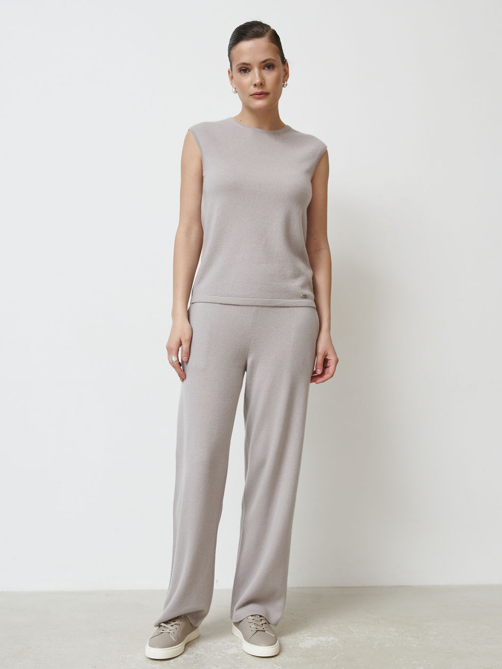Идеально сочетаются с кашемировыми топами, джемперами и кардиганами в тон или контрастных оттенках. Подходят как для домашнего уюта, так и для спокойных casual-образов.