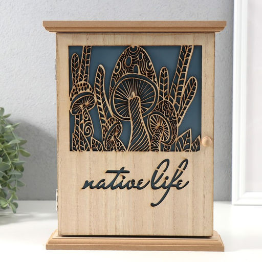Ключница настенная «Грибы», дерево, 6 крючков, бежево-синяя, 6.2×19.5×25.2 см