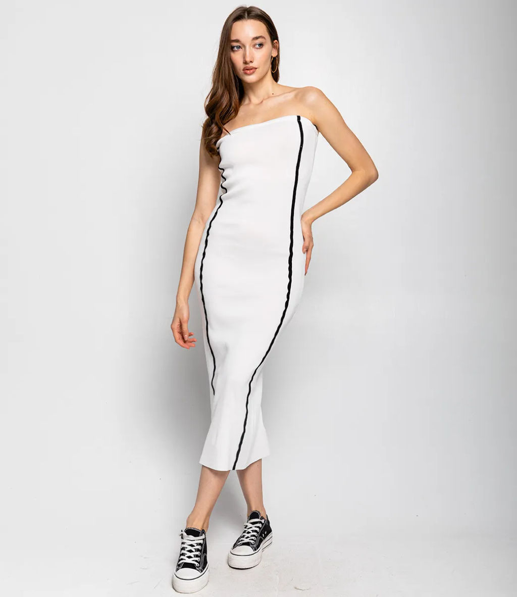 Это платье прекрасный выбор для вашего магазина, предлагая стильный и универсальный дизайн, который станет отличным дополнением к гардеробу ваших клиентов. Платье имеет облегающий силуэт и длину миди, что создает элегантный и современный образ. Строгие линии делают его одновременно простым и эффектным. Без бретелек, что подчеркивает плечи и декольте. Платье декорировано вертикальными белыми линиями по бокам, которые делают более интересным. Эти линии придают изделию графичный и стильный вид. Изготовлено из ткани 65% хлопок, 35% полиэстер и 5% эластан, платье обеспечивает отличное качество и приятные тактильные ощущения. Независимо от сезона, она станет любимым элементом в гардеробе ваших клиентов. На странице сайта доступна таблица размеров, что позволит вашим покупателям легко найти подходящий вариант. Установленная цена делает это платье доступным для широкой аудитории, что обеспечит вам высокий уровень продаж. Рост 168 см, 85-63-92.­