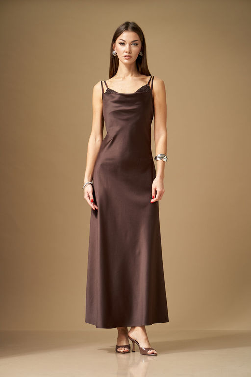 Платье выполнено из атласной ткани, полуприлегающего силуэта, покроенное по косой. По переду на груди качель, в которой виден нижний топ. Платье на бретелях с регуляторами длины.
