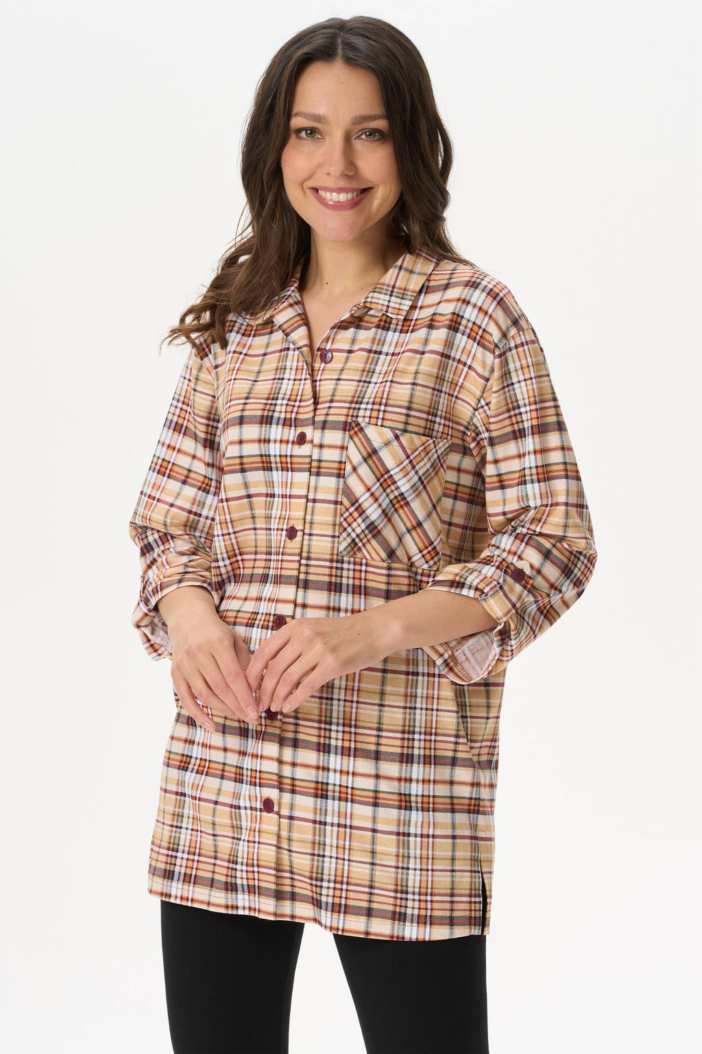 Рубашка прямого силуэта с отложным воротником из хлопкового полотна. Застежка на пуговицы. Накладной карман, по низу разрезы в боковых швах. Втачные рукава 3/4 с патами и пуговицами. Рост модели на фото 170.­