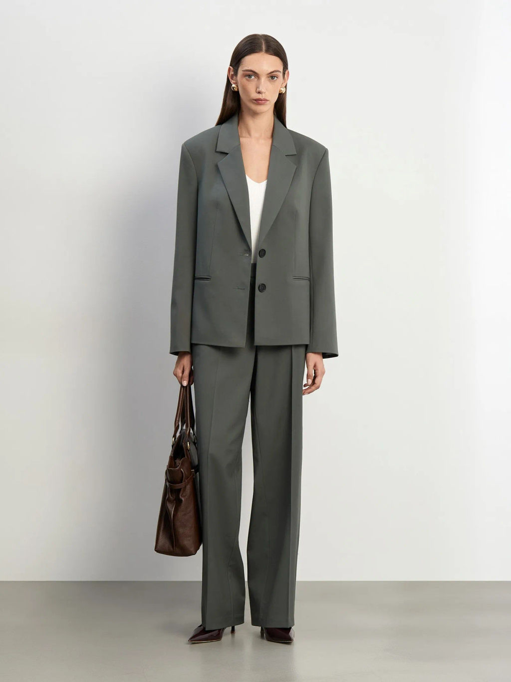 Брюки цвета хаки для модных повседневных образов. Выполнены из материала с содержанием шерсти: её чуть меньше половины. Свободная модель прямого кроя имеет высокую посадку. Дополнена широкими шлёвками для ремня. Сзади располагается один декоративный узкий карман с листочкой. Завершить образ с брюками можно жакетом из комплекта и базовой водолазкой.