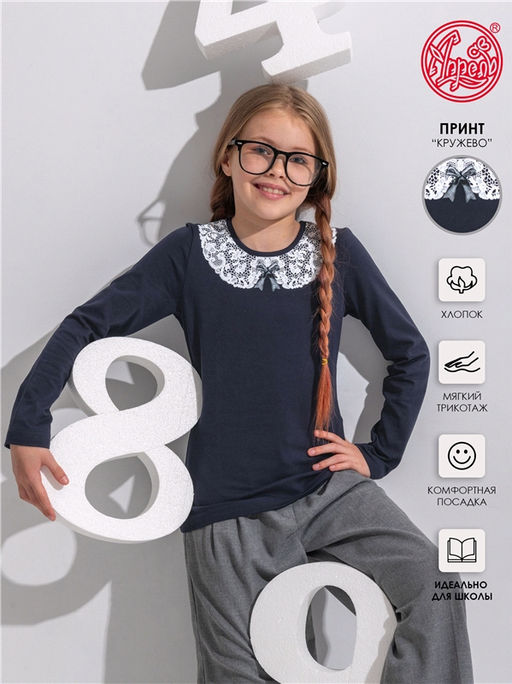 лонгслив,хлопок 92% + лайкра 8%,кулир с лайкрой / хлопок 92% + лайкра 8%,темно-синий82 / - / Ажурный воротник на темном / - / - / -,Лонгслив для девочки выполнен из кулира - легкого хлопкового полотна с лайкрой. Изделие с длинными рукавами, декорировано печатью, имитирующей кружевной воротничок. Незаменимый предмет гардероба для школьниц! Уход: только машинная стирка (руками не стирать!) при температуре 40 градусов, без предварительного замачивания. Изделия с печатью и декором перед стиркой необходимо вывернуть на изнаночную сторону.