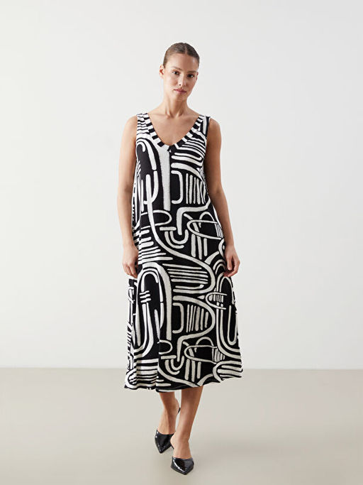 V Yaka Desenli Elbise