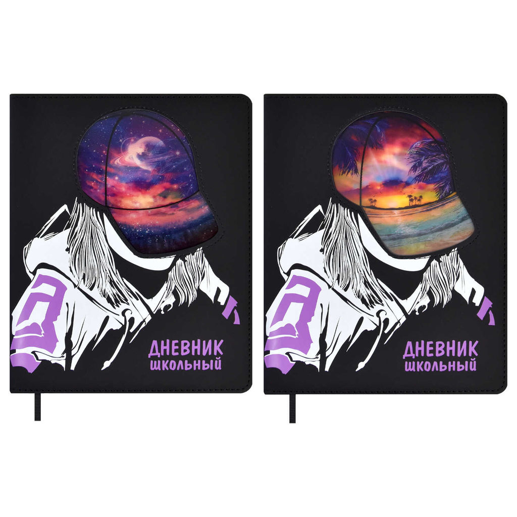 Дневник школьный арт. 62132 / 15 ДЕВОЧКА В КЕПКЕ (кожзам: А5+; твёрдый переплёт с поролоном, материал обложки: искусственная кожа "Софт-тач"; декор: аппликация с анимированным изображением, шелкография в две краски; способ крепления блока: ниткошвейный; вн. блок: 48 л., белый офсет 80 г/м?, печать в одну краску, справочный материал: универсальная шпаргалка; отделка среза: окрашивание пантоном; закладка: одно ляссе; форзац: печать в одну краску; индивидуальная упаковка: ПЭТ-пакет)