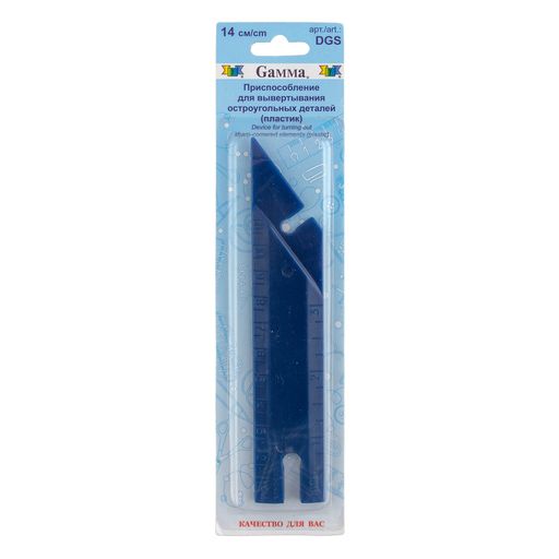 Описание Приспособление Gamma DGS. Материал - пластик. Помогает: 1) придавать форму деталям, имеющих острые углы, аккуратно выравнивая их изнутри, 2) пришивать пуговицу, позволяет регулировать длину ножки пуговицы. Длина приспособления 14 см