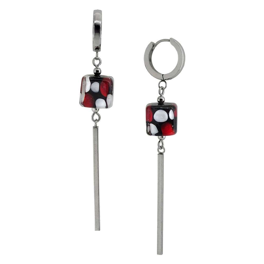 Серьги изготовлены из муранского стекла и гипоаллергенной ювелирной стали, что очень важно для людей с чувствительной кожей. Металл не темнеет и не подвергается воздействиям окружающей среды, надолго обеспечивая красивый внешний вид изделия. Длина серег - 7 см. Диаметр стеклянных кубов - 1.  Вес обеих серег - 20 гр.