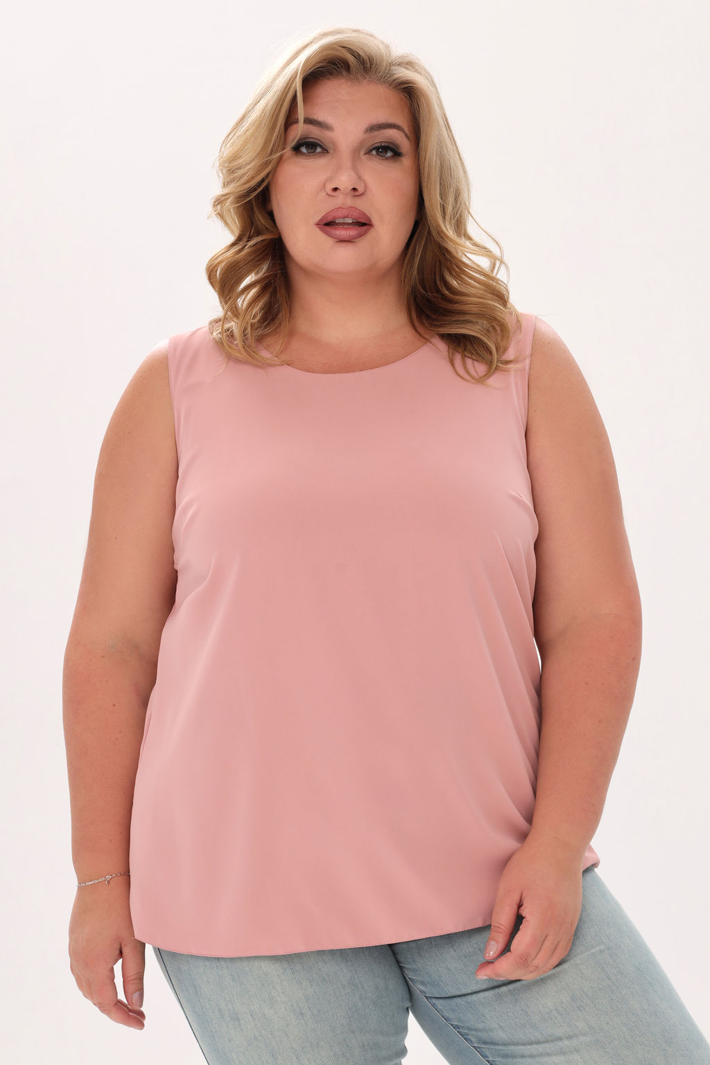 Классический однотонный топ свободного кроя из струящегося материала на широких бретелях. Круглый  вырез добавляет модели женственности и романтизма. Модель можно комбинировать с юбками и брюками, так же будет хорошей базой под пиджаки и жакеты. Топ позволяет выглядеть стильно при минимальных финансовых затратах.