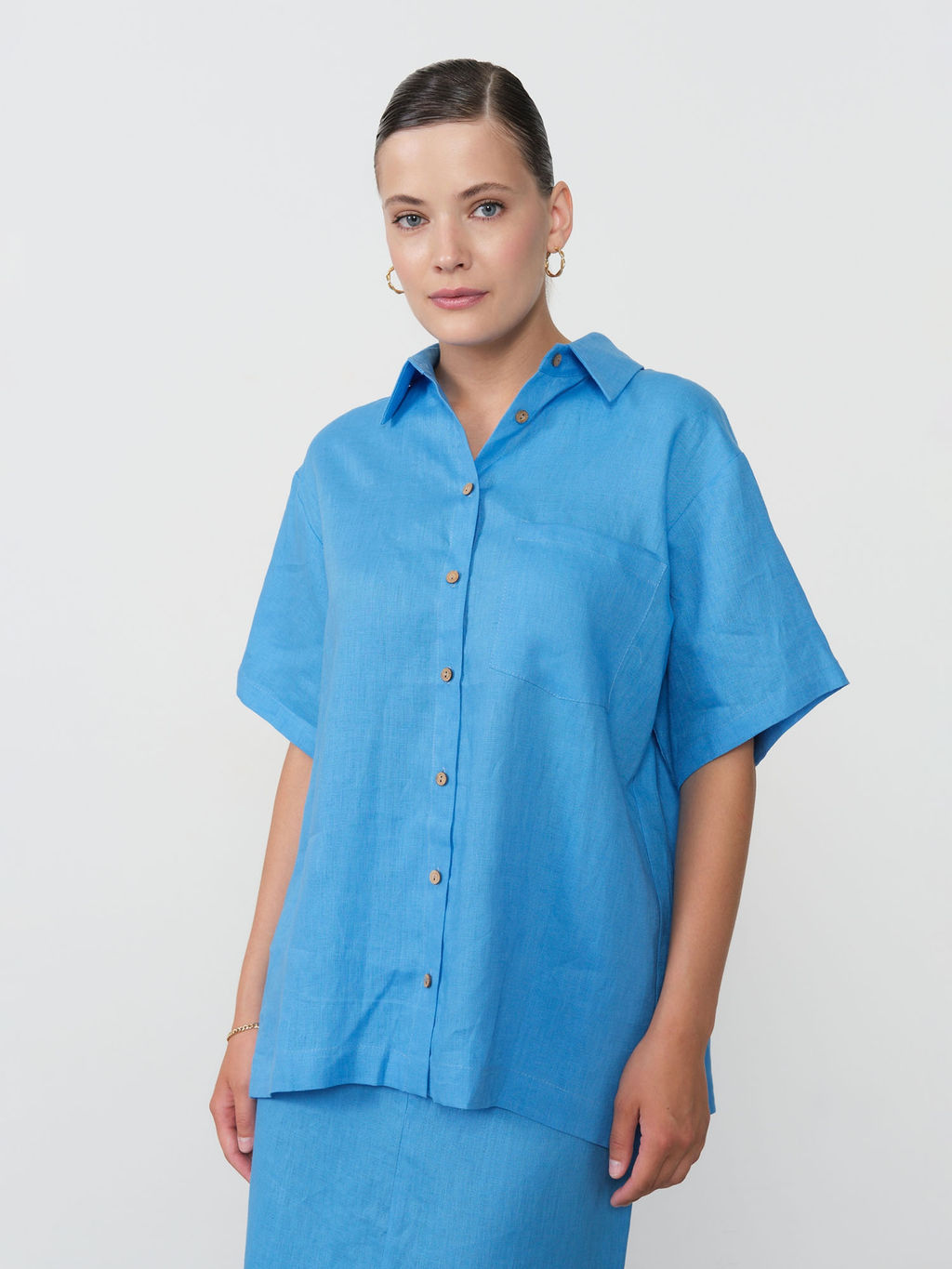 Насыщенный оттенок аквамарин привносит свежесть и яркость в летний гардероб, великолепно сочетаясь с белыми, бежевыми, темно-синими и даже коралловыми оттенками. Эта рубашка станет отличной основой для создания множества образов от повседневных с джинсами и шортами до более элегантных с льняными брюками или юбками.